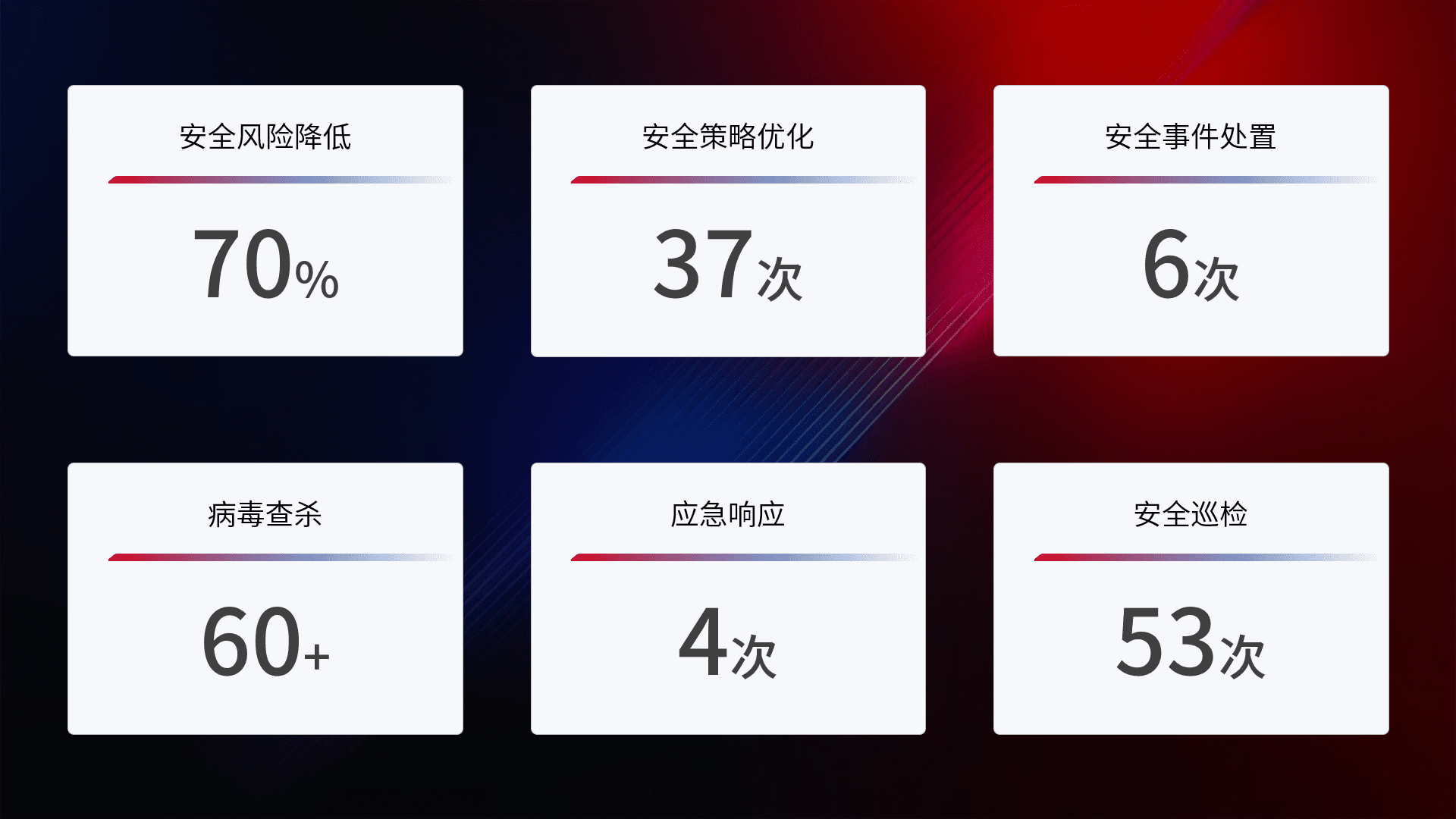 提供全面的安全事件报告体系,,,,包括处置报告、、周报、、、、季度和年度总结,,结合持续监控,,帮助客户深入了解网络安全状况。。。。