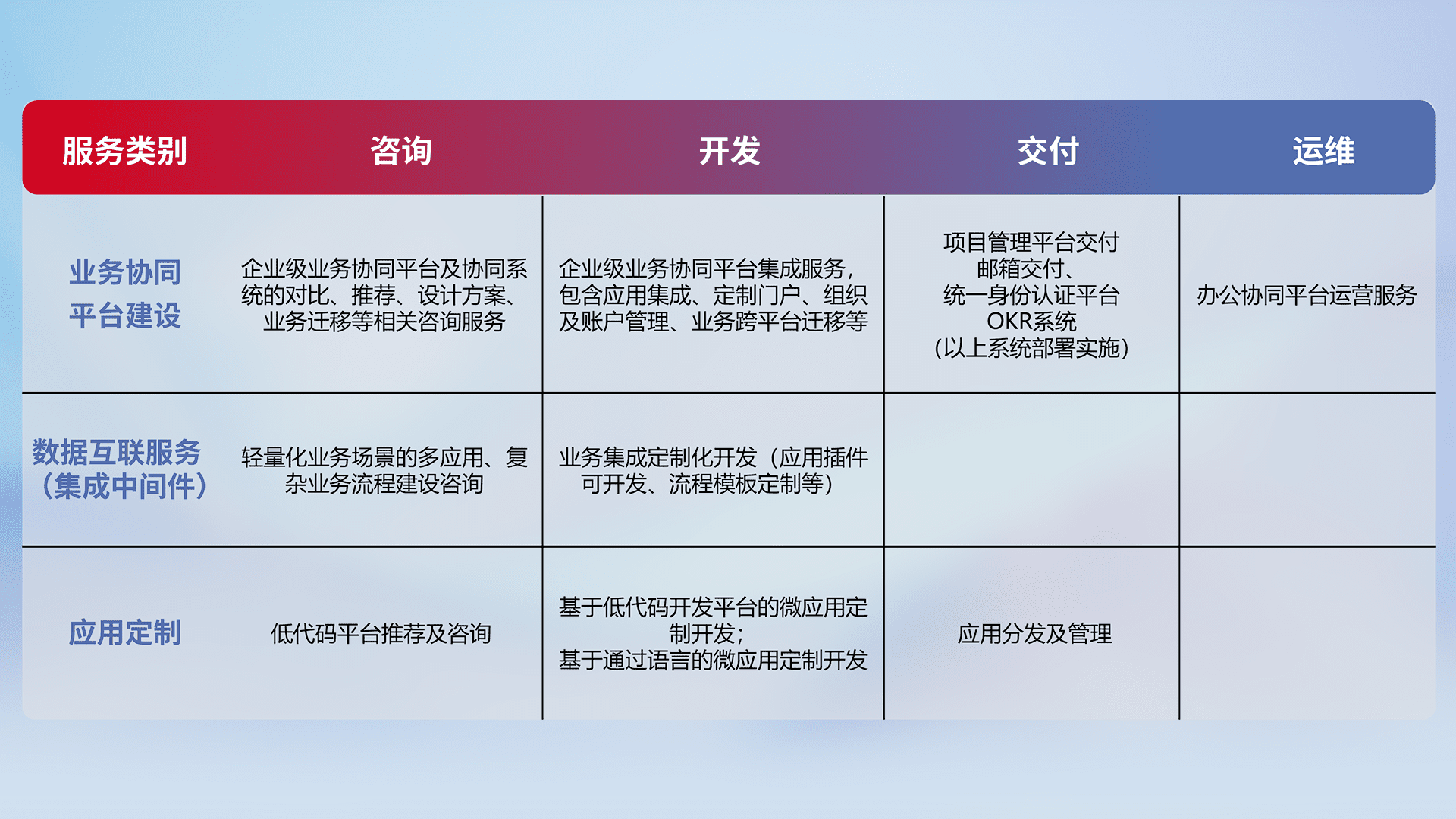 针对钉钉、、、、企微、、、IDaas等平台级产品提供产品的规划、、方案、、交付、、定制化开发等服务,,实现如统一协同办公、、、、智能客户服务、、、混合会议管理、、、、智能数据查询、、、等业务场景,,,,实现数字化转型。。