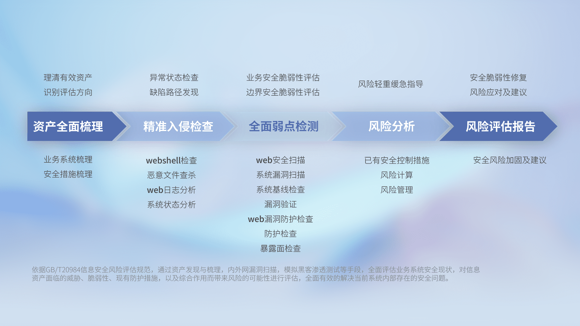 针对客户行业特性,,,以专业的安全服务+多厂商联合解决方案提供专属的一站式安全管理服务,,,,帮助客户全面感知网络空间威胁,,,,基于识别、、、检测、、、分析、、、、防护、、监测、、、响应的服务理论模型,,,从方案咨询、、、、集成交付、、评估验证、、优化加固、、、运维运营,,,致力于为客户提供完整的闭环管理式安全服务。。。。以实战经验为客户打造高抵御风险的安全体系,,帮助客户发现威胁、、对抗威胁、、、、处置威胁,,,,不断积累安全对抗能力,,持续保障数字化安全。。
